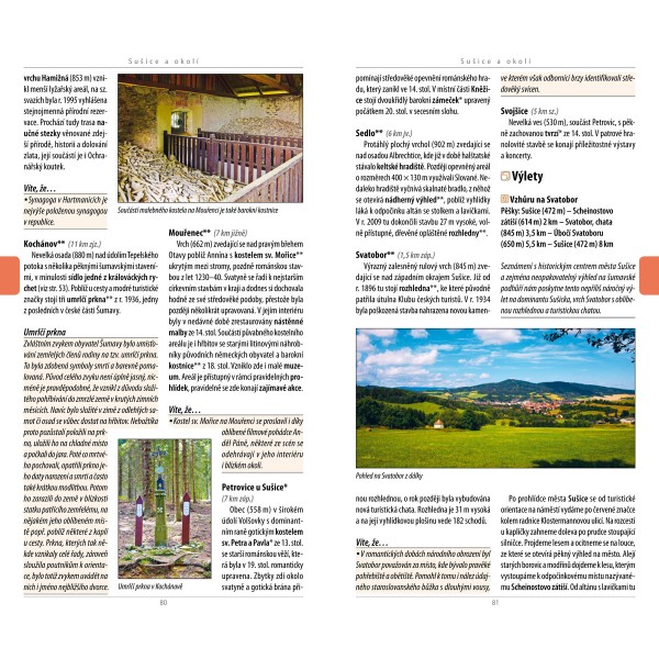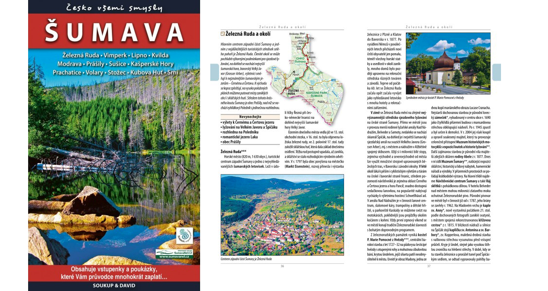 Průvodce Šumava z edice „Česko všemi smysly“ vyšel poprvé v r. 2011 a byl již beznadějně rozebraný – proto v r. 2019 přichází nakladatelství S & D (Soukup & David) s jeho druhým, aktualizovaným vydáním. Představuje jednu z turisticky nejoblíbenějších destinací, zajímavé a důležité informace zde najdou zájemci o poznávání, pěší turisté, cyklisté, lyžaři i vodáci, nechybí ani tipy na dovolenou s dětmi.Popis vychází z několika vybraných turistických center, věnuje se přírodě i památkám, najdeme tu nabídku výletů, velmi užitečné jsou aktuální praktické informace, kontakty, webové adresy, telefonní čísla atd., nezapomínáme ani na bavorskou a rakouskou stranu Šumavy. Samozřejmostí jsou pěkné barevné fotografie a mapy. A samozřejmě nesmíme zapomenout, že úplně vzadu najdeme náš tradiční dárek pro Vás, soubor vstupenek a poukázek, jejichž hodnota výrazně přesahuje cenu této publikace. Vešlo se jich sem hned 42!Platnost vstupenek do konce r. 2022.